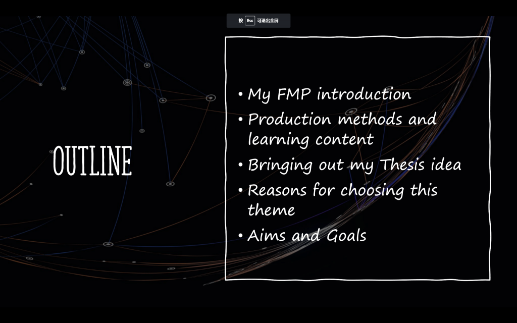 Hi, Today I would like to give a presentation on the topic of exploring the methods of making good animated short films.Here is my outline. There are 5 topics to talk about around my fmp and thesis.